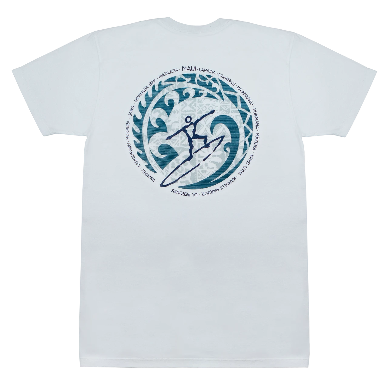 This design features a petroglyph inspired surfer while showcasing some of Maui’s most famous and wellknown wave riding beaches.