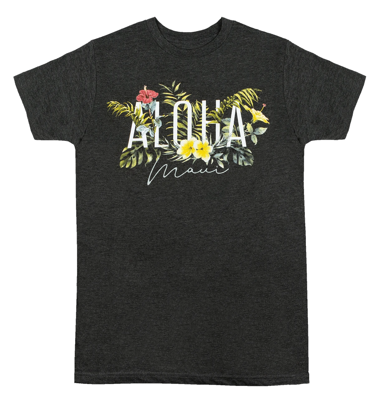 Garden Aloha Hawaii tee blooming with red and yellow hibiscus flowers and monstera fern leaves.