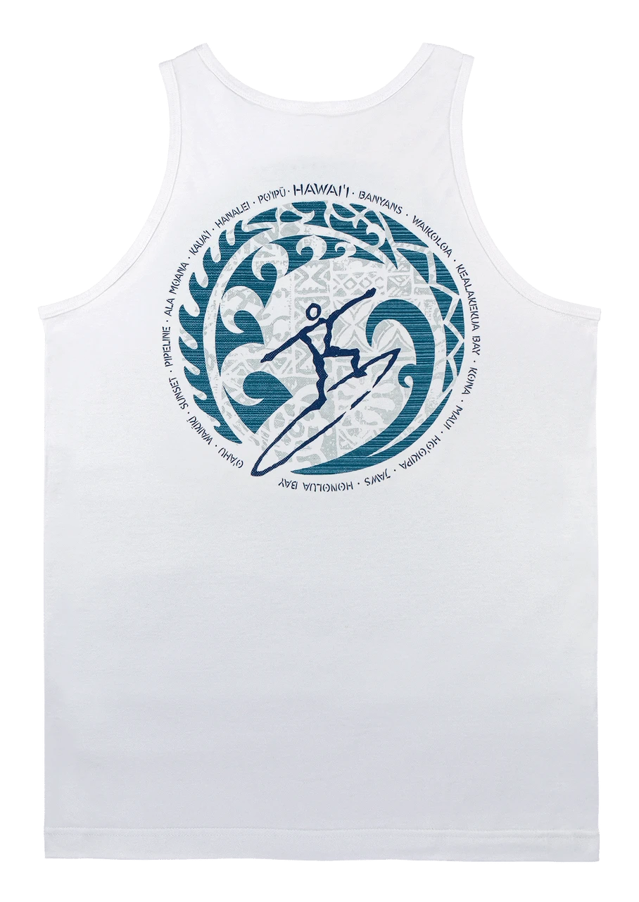 This design features a petroglyph inspired surfer while showcasing some of Hawaii’s most famous and wellknown wave riding beaches.